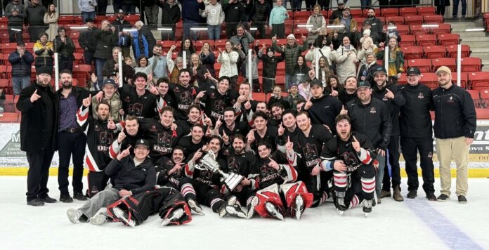 Photo contributed. The Cape Breton West Blackstone Knights celebrate following their 3-2 Game 5 victory over the Cape Breton County Islanders in Membertou, clinching the Vince Ryan Cup.